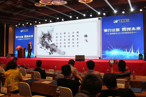 榮成市隆通貿(mào)易有限公司總經(jīng)理張黎明在大會上作了題為“騰飛 2018”的主題演講,他從定位、服務(wù)、客戶管理三個渠道入手,向與會者分享了成功的營銷經(jīng)驗和營銷體系構(gòu)建案例,為代表們?nèi)蘸笤谑袌錾瞎コ前握峁┝丝蓪嵤┬缘膮⒖冀?jīng)驗。
