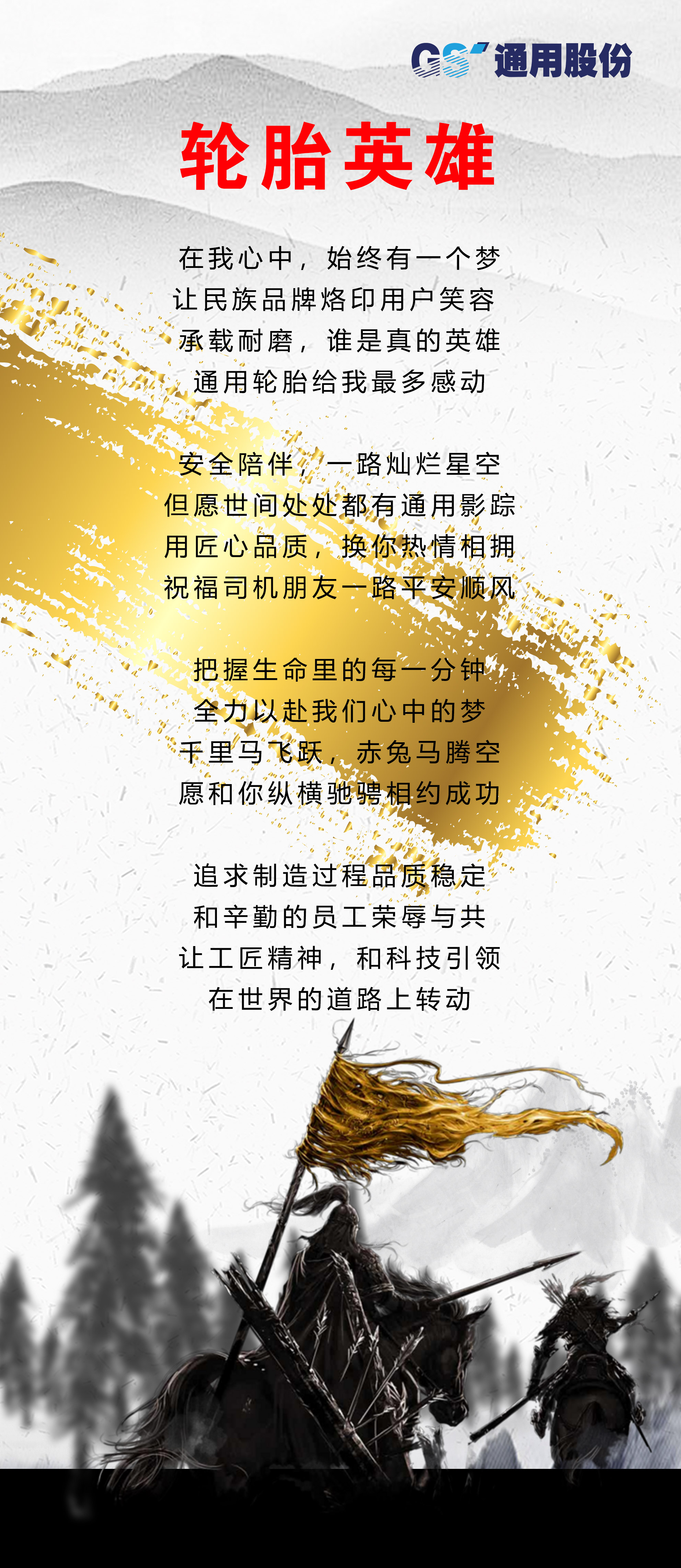 滄海橫流,自強不息,方顯英雄本色。今年,通用股份以一首創編的《輪胎英雄》拉開了“科技質量月”的帷幕,在這個風起云涌的競爭時代,全體通用人堅守初心,以振興民族品牌為己任,為向廣大消費者提供更加卓越的產品與服務而不斷努力奮斗,推動企業邁向高質量發展。