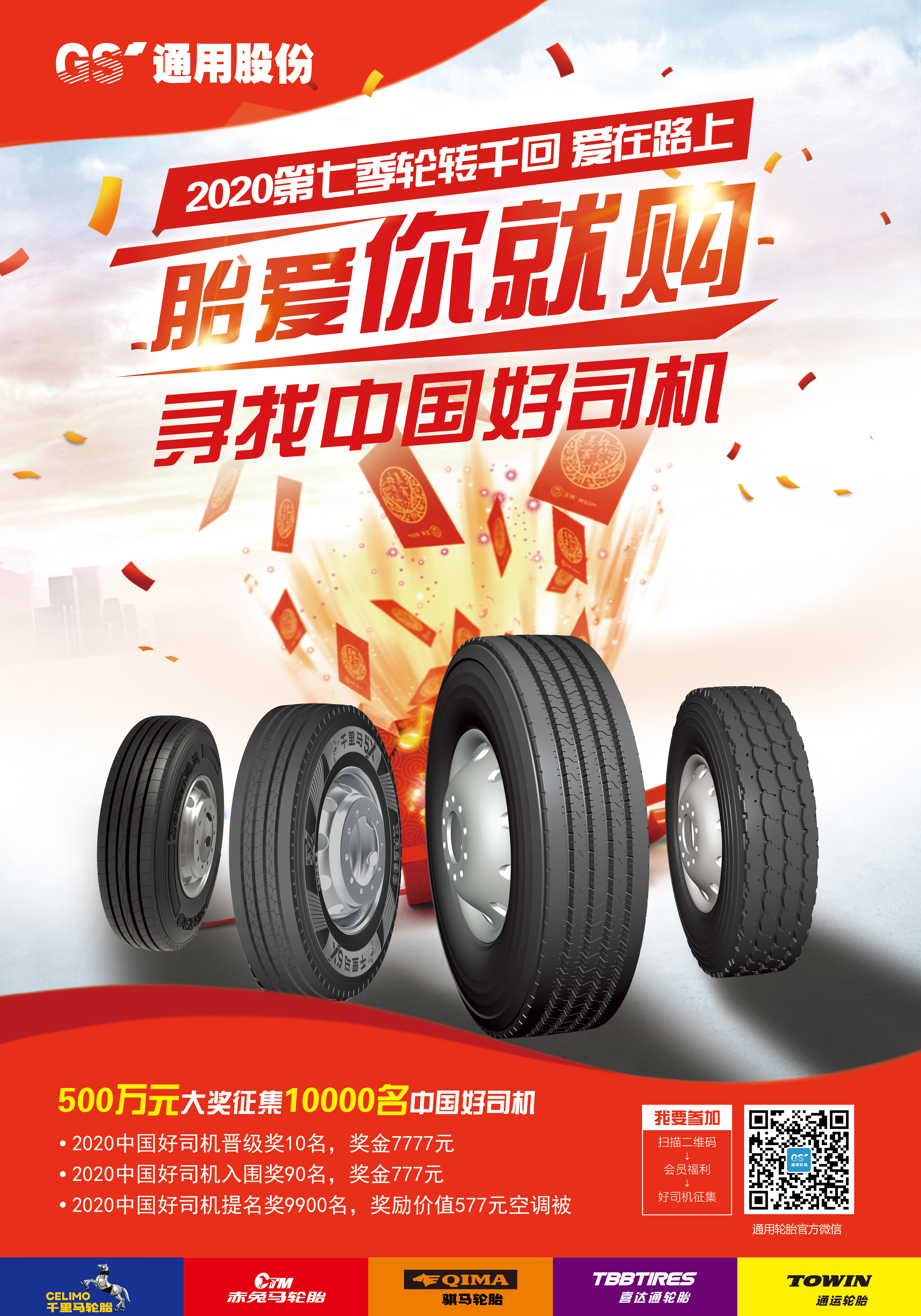 本次“胎愛你就購”七夕紅粉季,為了走近卡車人的生活,了解他們生活的悲歡喜樂,展示中國卡車司機的正能量,在優惠回饋的基礎上,通用股份福利再升級,重磅推出“尋找中國好司機”活動,為中國卡車司機提供展示自我風采的舞臺,不僅有機會獲得精美好禮,最高還能贏得7777元現金大獎。