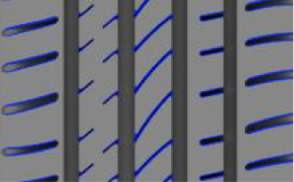 非對(duì)稱的花紋設(shè)計(jì)配合胎肩部橫溝的半封閉處理,增強(qiáng)了胎肩部的花紋的剛性,為輪胎提供優(yōu)異的操控性能的同時(shí),降低了輪胎的噪音,兼顧了輪胎的操控和靜音舒適性能。
